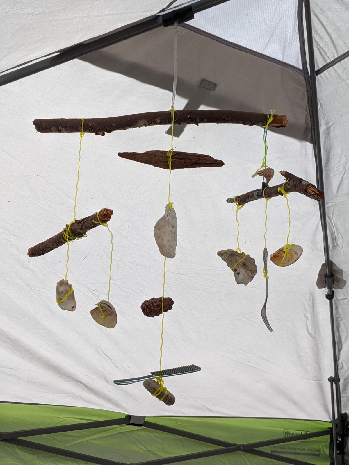 Everyone can agree on ice cream (whether we’re camping or not). The best example that I’ve ever written about creating shared value focuses on shipping containers. Everyone agreed on ice cream because it’s delicious and it also inspired excellent behaviour from everyone who wanted the tasty treat. This said, every day can’t be smores and ice cream, so we found other ways to create shared value, like creating art from treasures we found for all to enjoy. Kids enjoyed finding creative treasures and my dad and I liked using repurposed materials to build out windchimes/mobile.