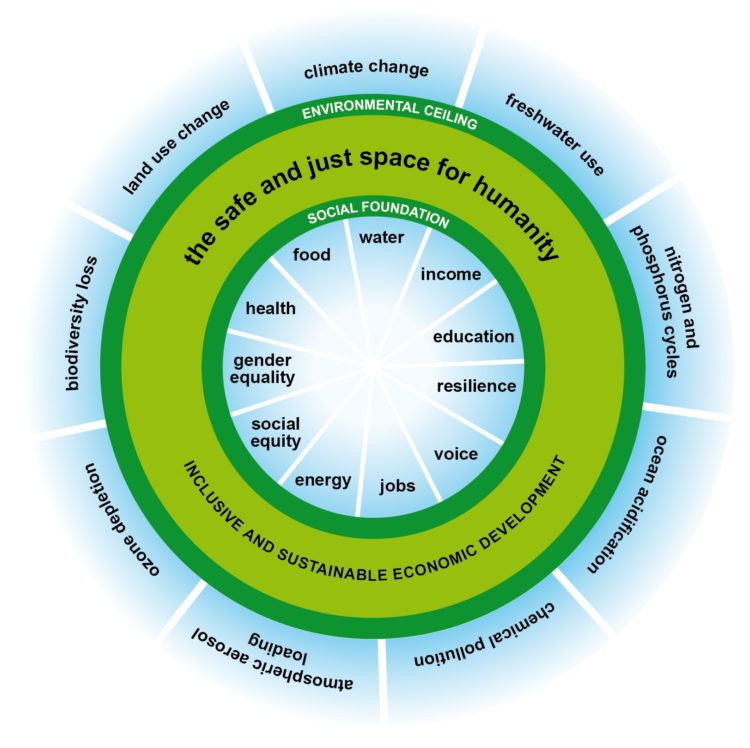 “The Doughnut of social and planetary boundaries combines two concentric radar charts to create a concise visualization of the dual conditions –social and ecological–that together underpin human wellbeing. The social foundation demarks the Doughnut’s inner boundary, below which lies critical human deprivation, while the ecological ceiling demarks its outer boundary, beyond which lies critical planetary degradation in terms of stress on major Earth-system processes. Between the two sets of boundaries lies the ecologically safe and socially just space for humanity.”