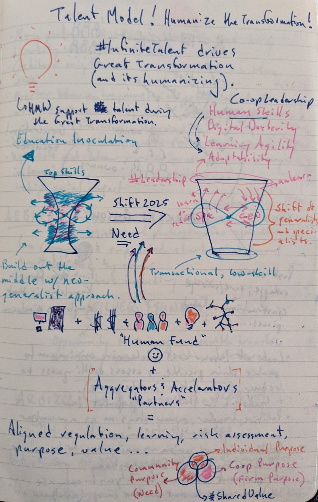 Stefano Zamagni, the world’s leading cooperative economist, illustrated how disruptive forces like automation, climate change, and precarious work will impact the global workforce. Below is my sketch of a key concept from Zamagni’s lecture – to summarize, the more emphasis we put on the industrialization and automation of work the less opportunities there will be for skilled workers to apply their talents (this idea is represented by the middle of the “hourglass” on the left side of the image below). According to Zamagni, highly specialized and low skilled workers will continue to find employment (Amazon needs engineers and machine learning developers to design mostly automated warehouses and front line workers with dexterity and problem-solving skills to complete the tasks that technology can’t).