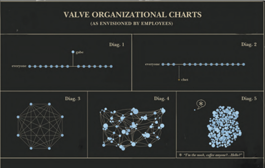 During one of my first leadership gigs I naively set out to build a flat and/or halocratic team, which was inspired – in part – by Valve’s handbook for new employees (one of the activities for new hires is to draw how they see the organizational structure … because it is highly adaptive based on the work).