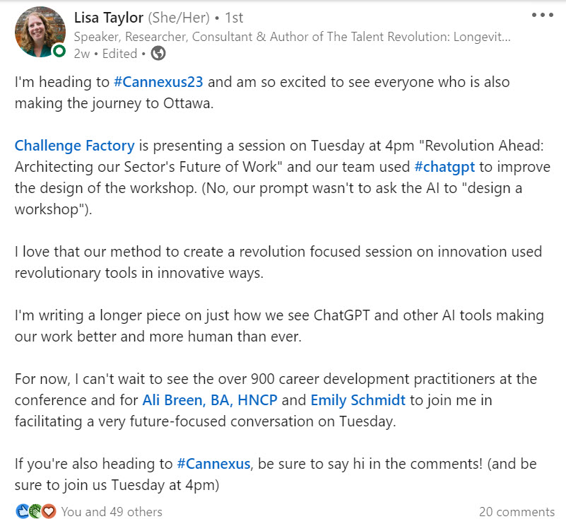 My friend Lisa Taylor gets it. ChatGPT and other AI tools are “making our work better and more human than ever”. Here is a story of how Lisa and her team used ChatGPT for a Cannexus23 conference presentation: